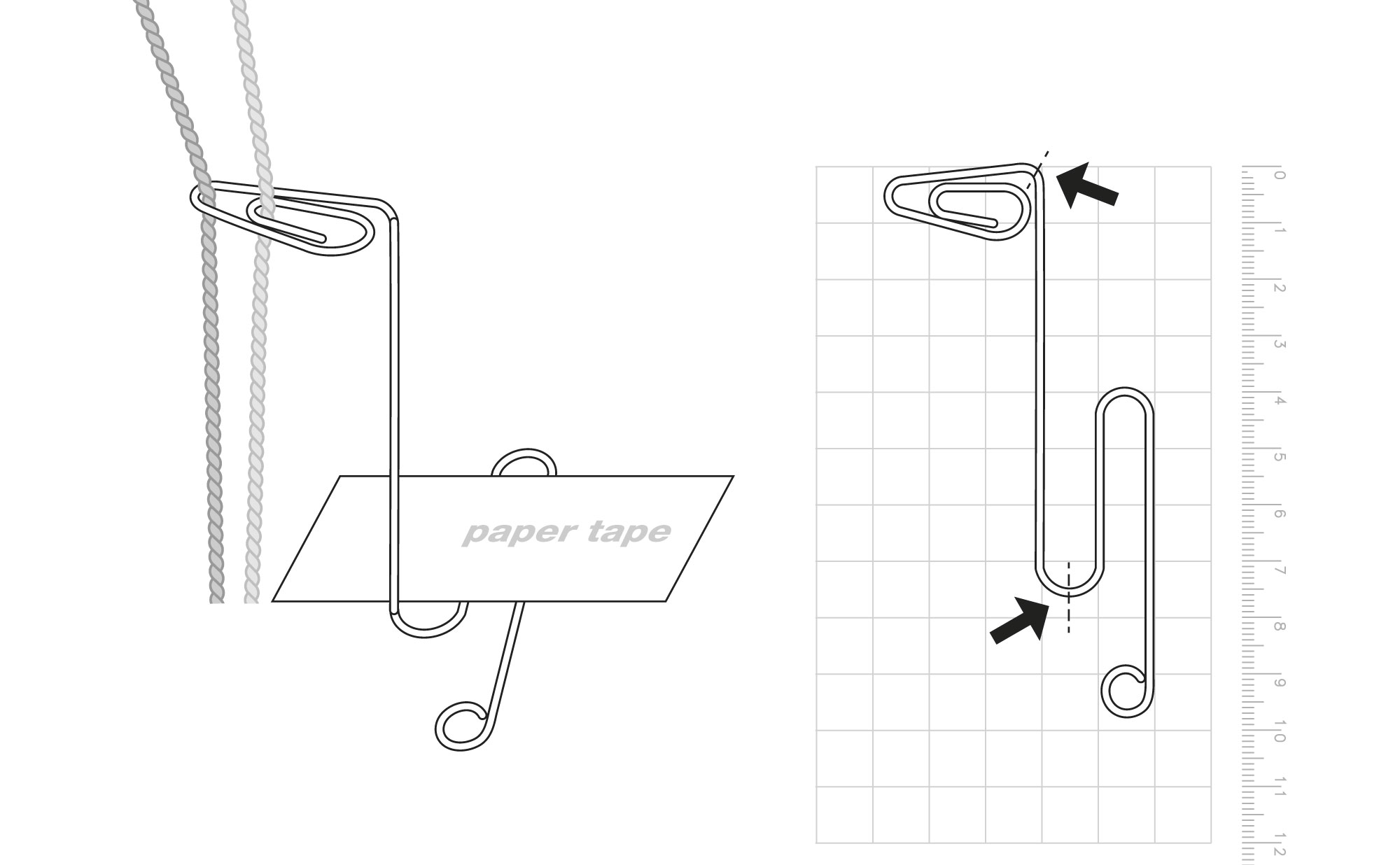 2. I due fili di lana colorati dovranno cadere giù dritti nel beccafilo (yarn feeder) e rimanere allineati uno davanti all’altro. Per aumentare la stabilità di questa posizione ho piegato un filo di acciaio armonico lungo circa 30 cm, da attaccare con il nastro adesivo sul Modamatic, esattamente sopra al beccafilo (vedi schema).