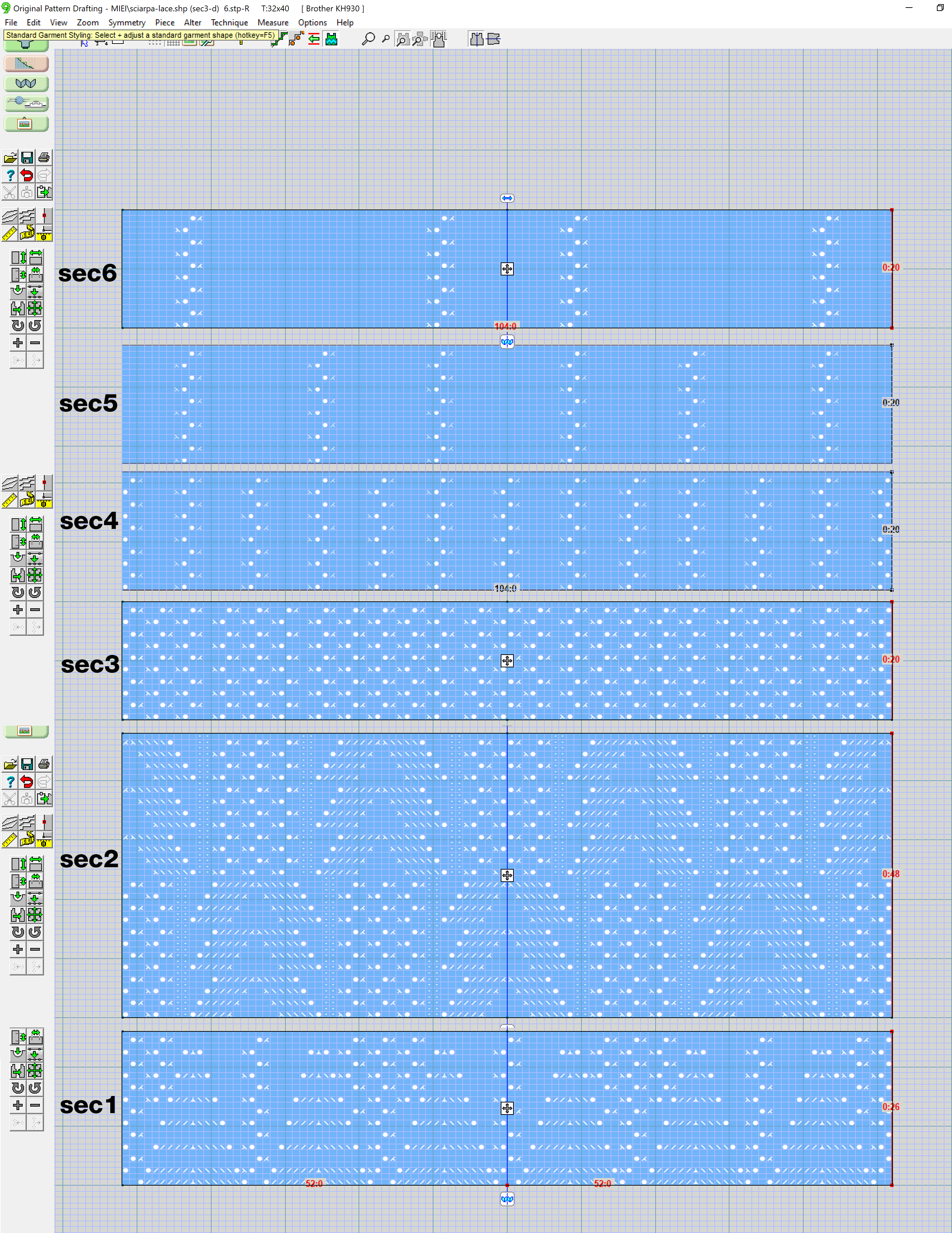 Questa suddivisione favorisce il download integrato del lavoro, in modo da impegnare correttamente la memoria della macchina (Brother KH930, rinominata FirstLady in Italia) che, per ragioni di spazio, non può acquisire più di una sezione alla volta.