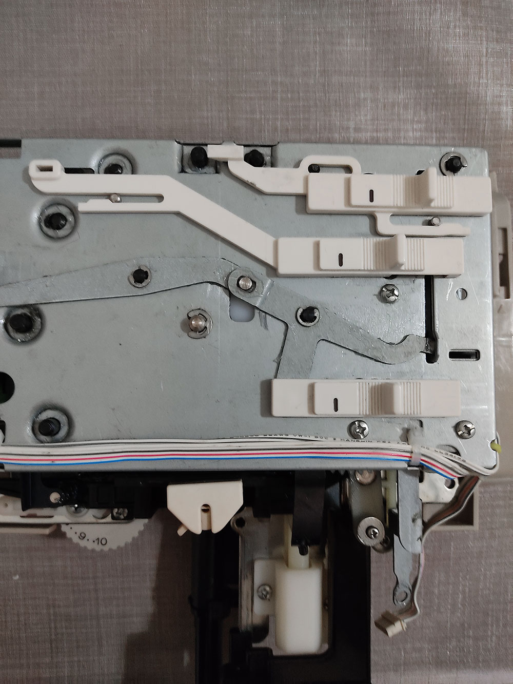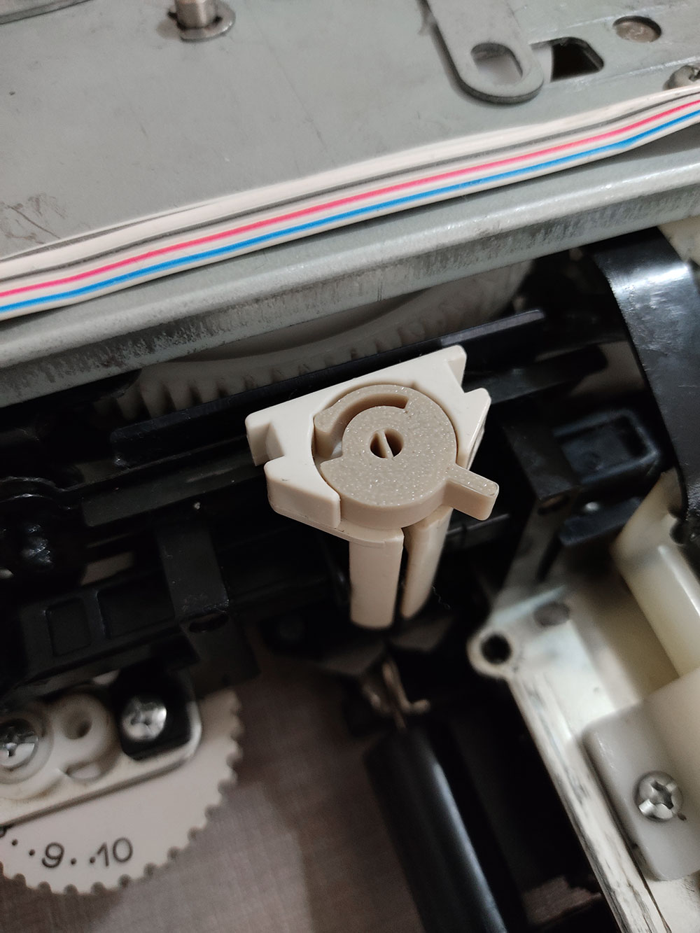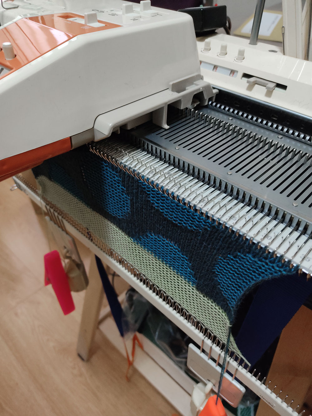 Grazie al pregevole lavoro di Susan Glaus, che da diversi anni condivide disegni 3D dei pezzi di ricambio per diverse macchine da maglieria, sono riuscita a modificare il mio Modamatic 3000 (KG 88II, credo) per lavorare a due colori, in vanisé (plating knitting).