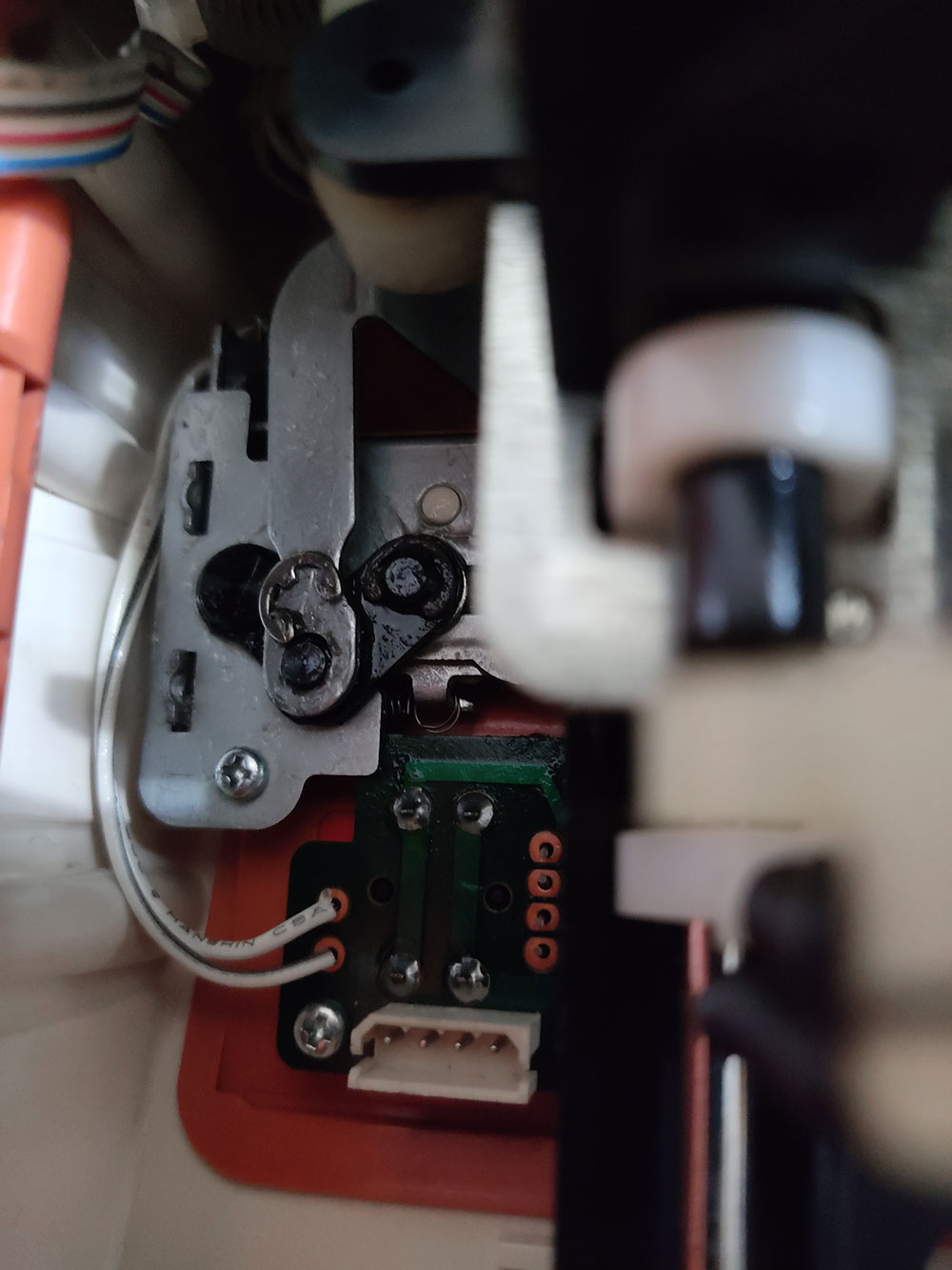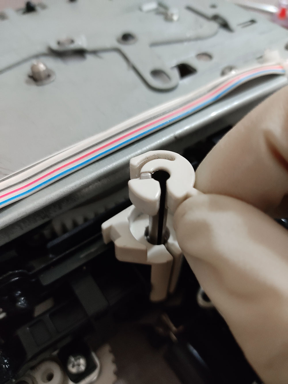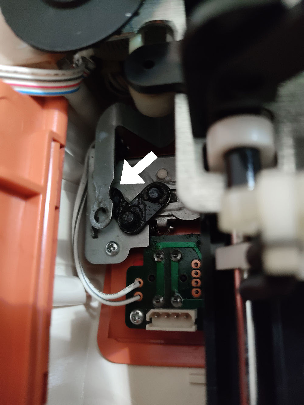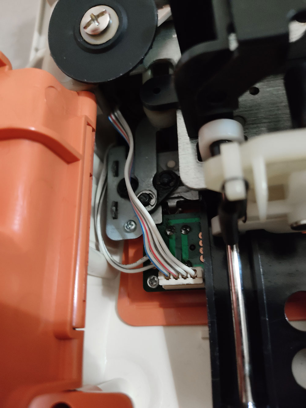 Andando al sodo, per modificare il Modamatic bisogna togliere la scocca e sostituire il tubicino mono-filato del beccafilo (yarn feeder) con quello doppio stampato in 3D, condiviso da Susan (lo trovi qui su Thingiverse )