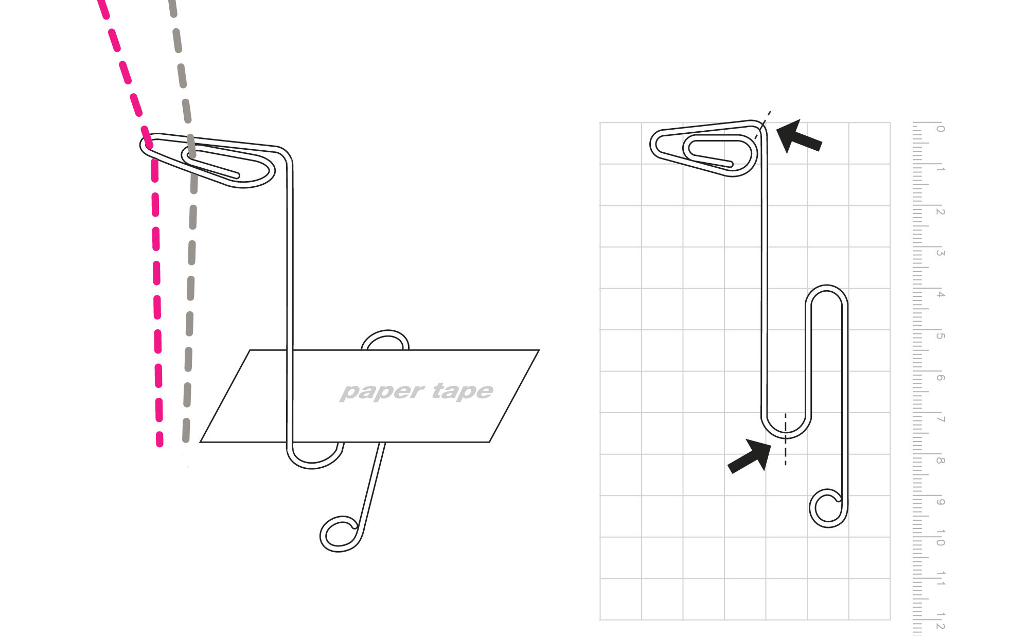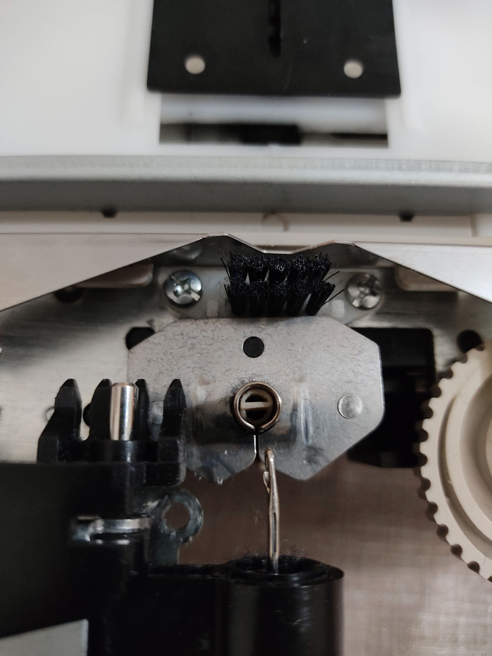 2. I fili di due colori differenti dovranno cadere giù dritti nel beccafilo (yarn feeder) e rimanere infilati uno davanti e l’altro dietro. Per aumentare la stabilità di questa posizione ho piegato un filo di acciaio armonico lungo circa 30 cm, da attaccare con il nastro adesivo sul Modamatic, esattamente sopra al beccafilo (vedi schema).